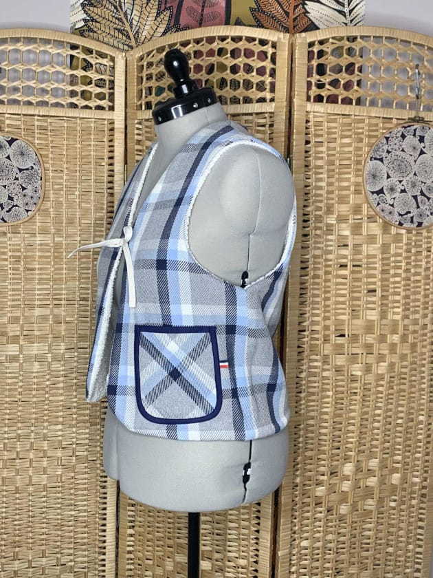 Il y a des poches sur la face à carreaux et un lien en coton pour fermer le gilet.